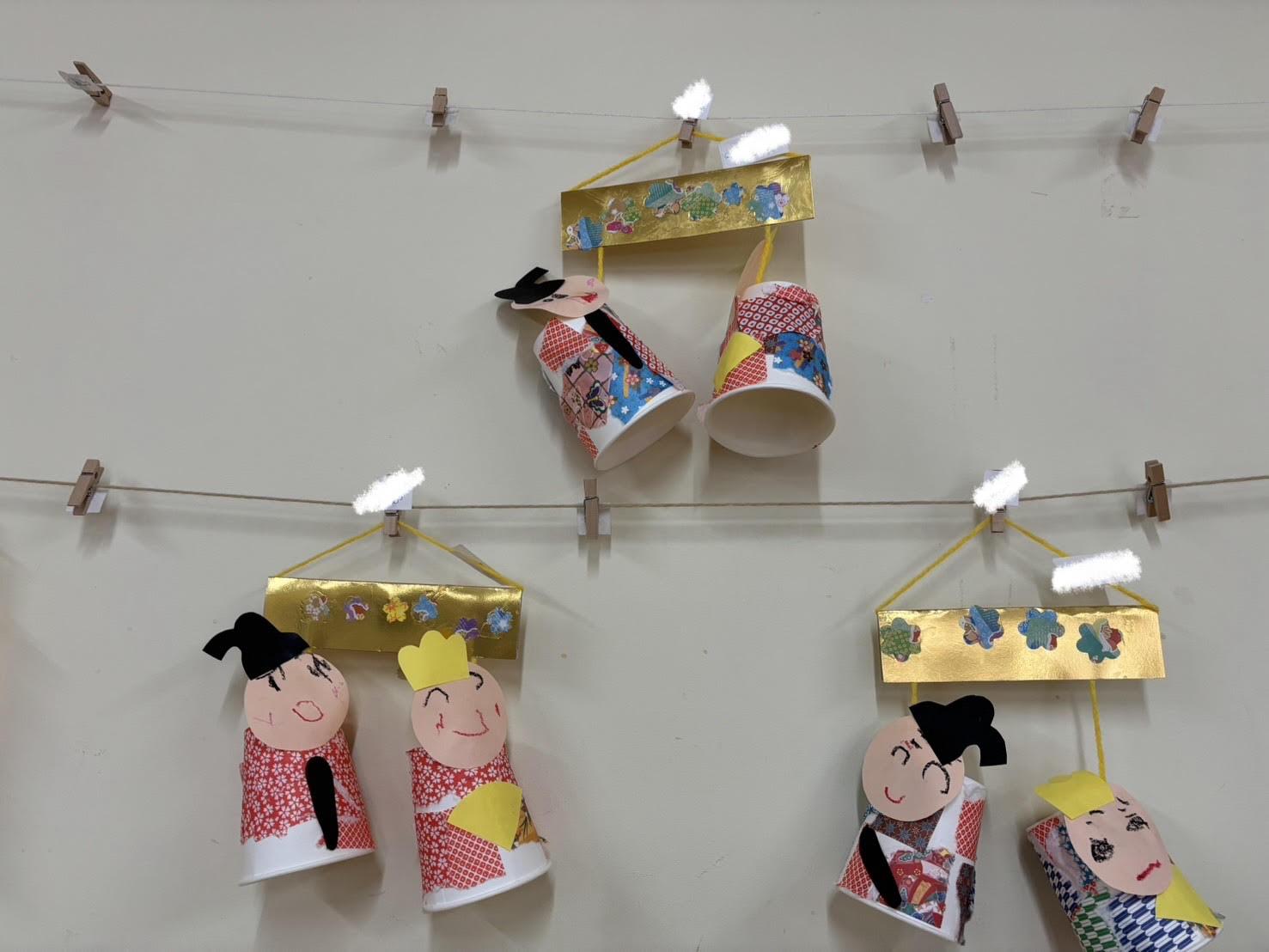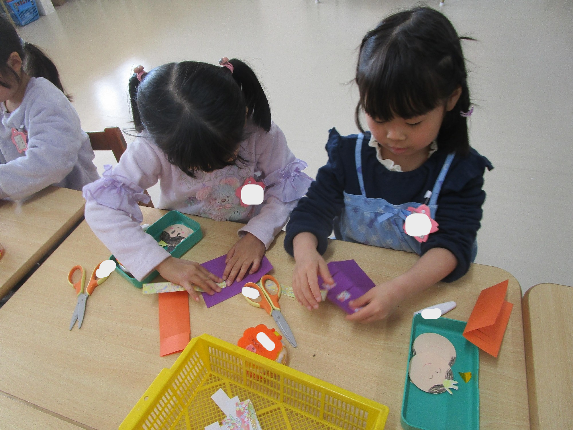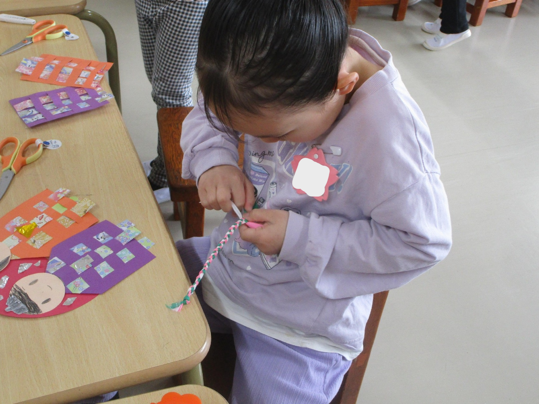 2月27日(金)、年少、年中、年長の3学年で、ひな祭りに向けて製作をしました。