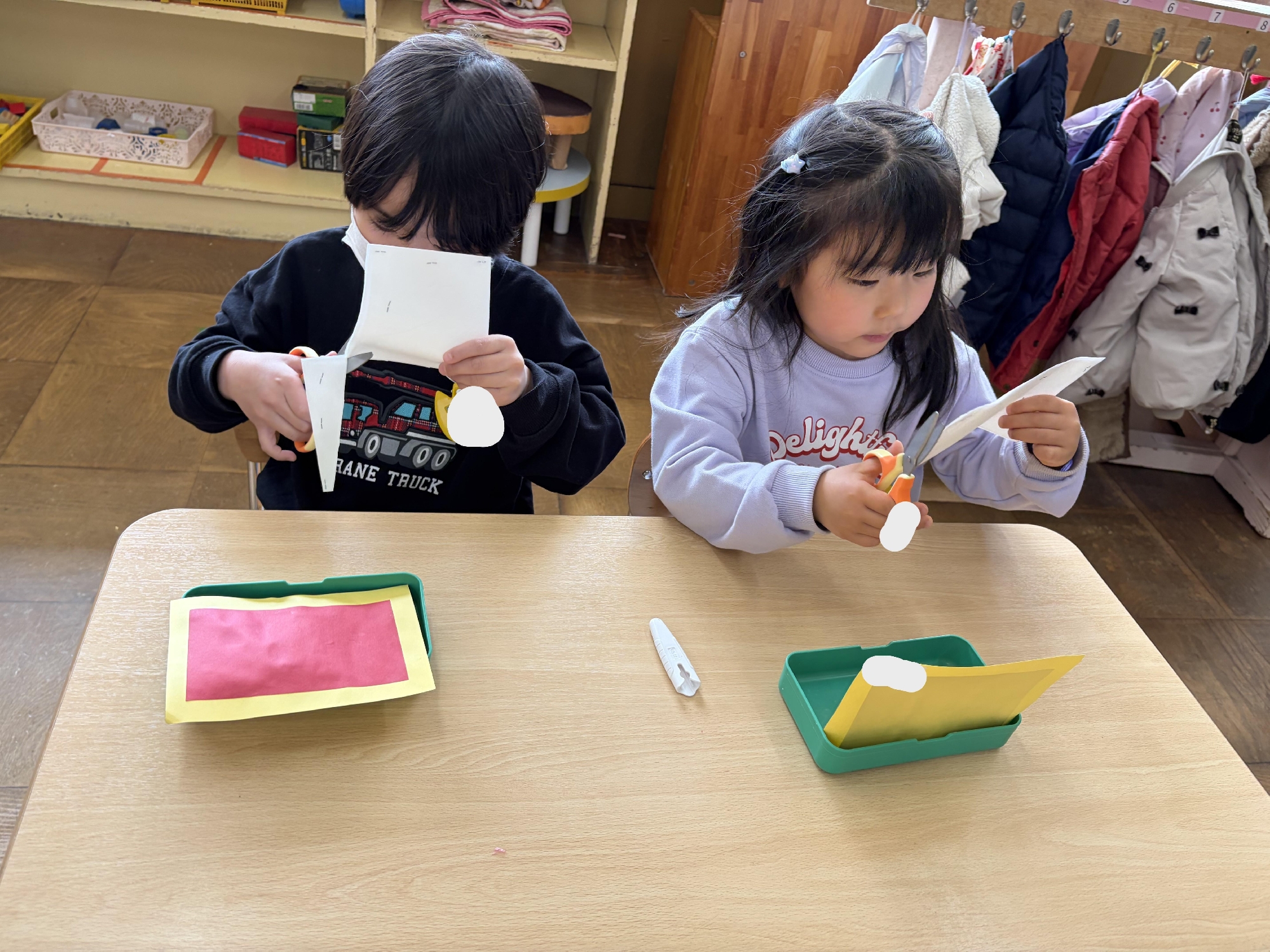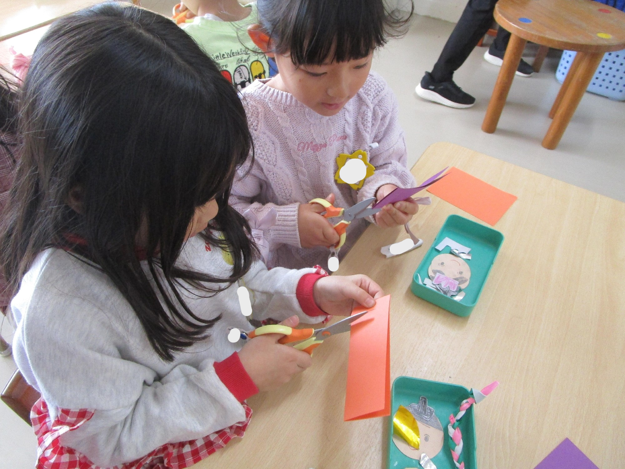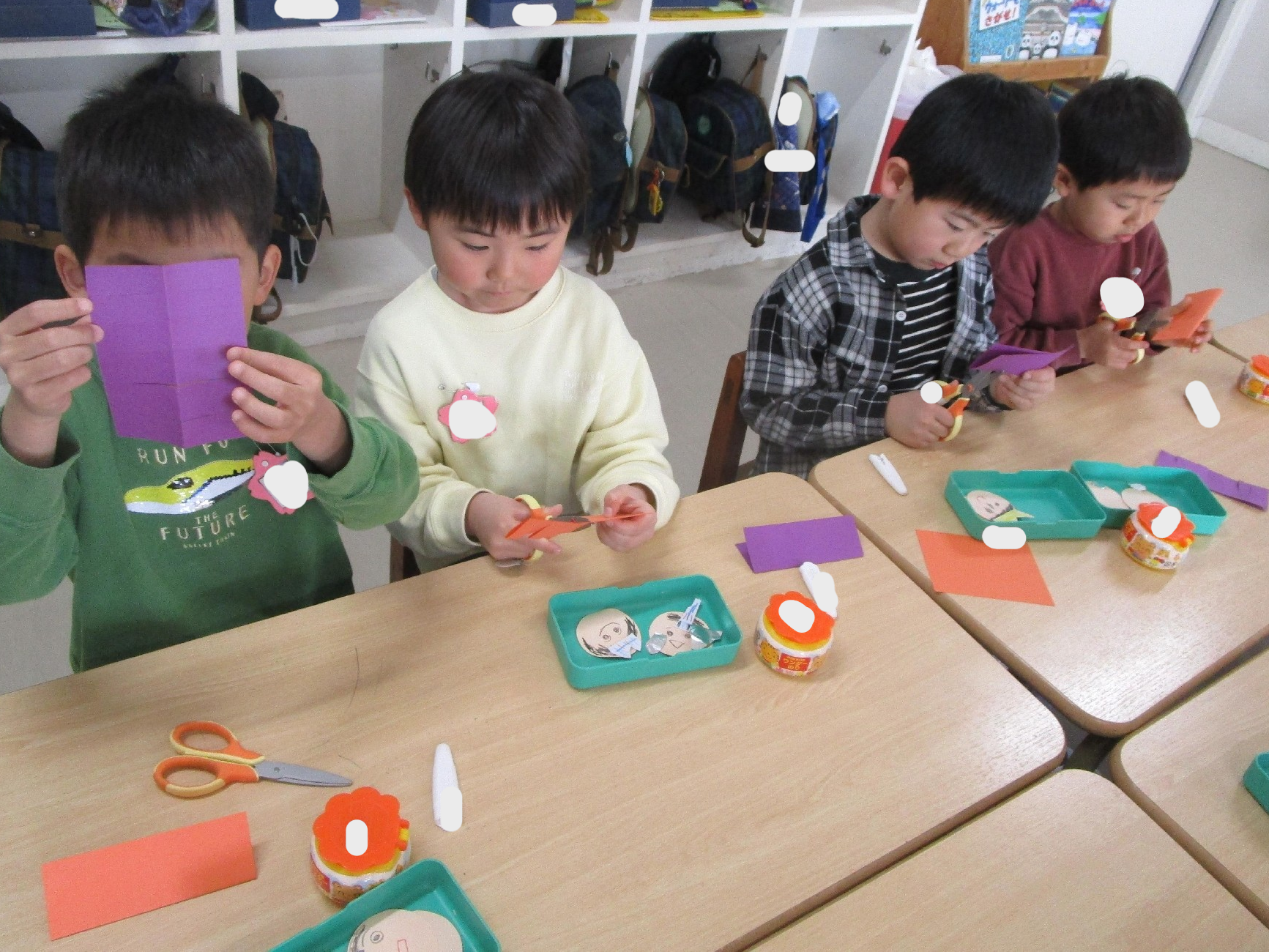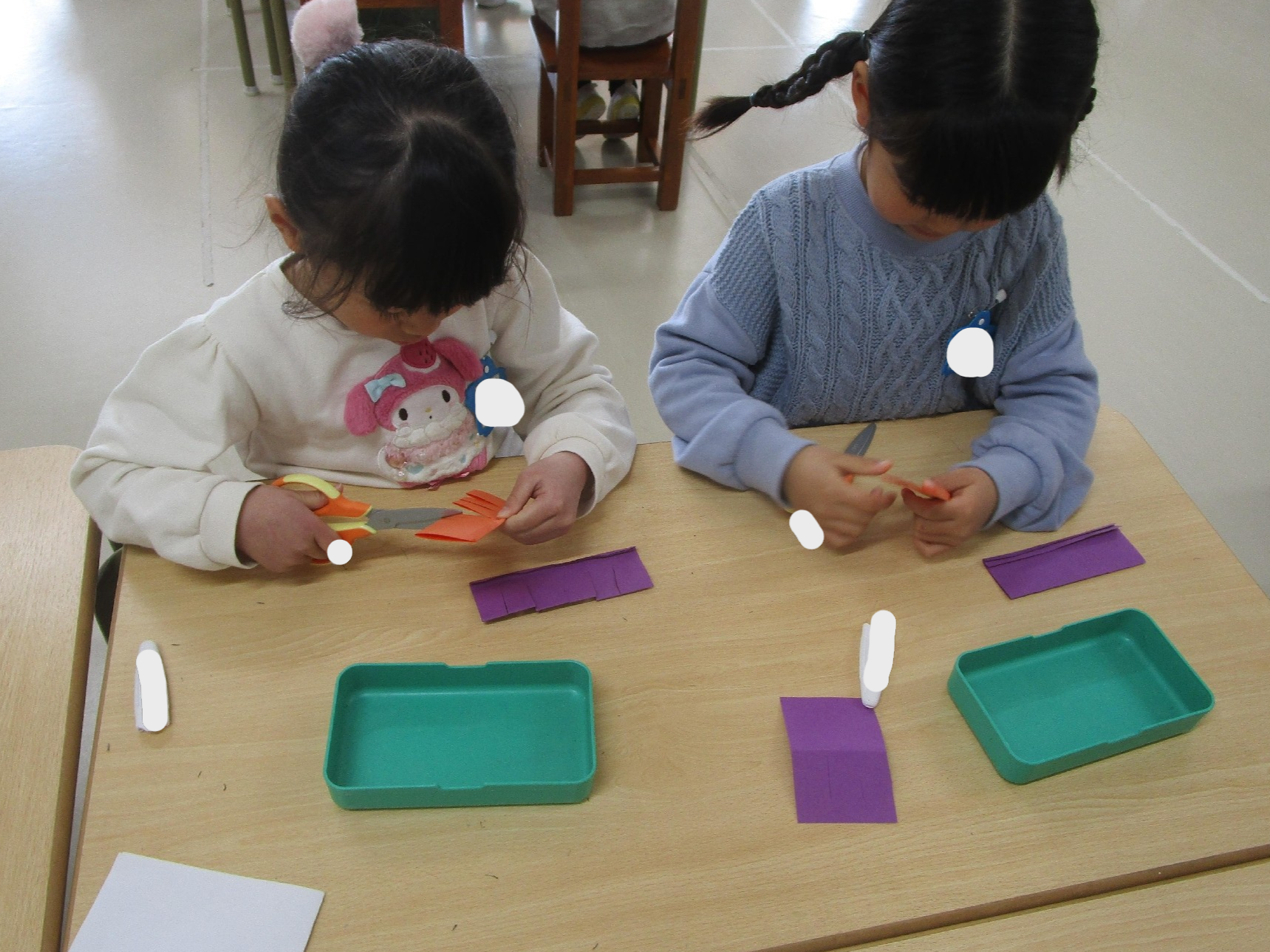 2月27日(金)、年少、年中、年長の3学年で、ひな祭りに向けて製作をしました。