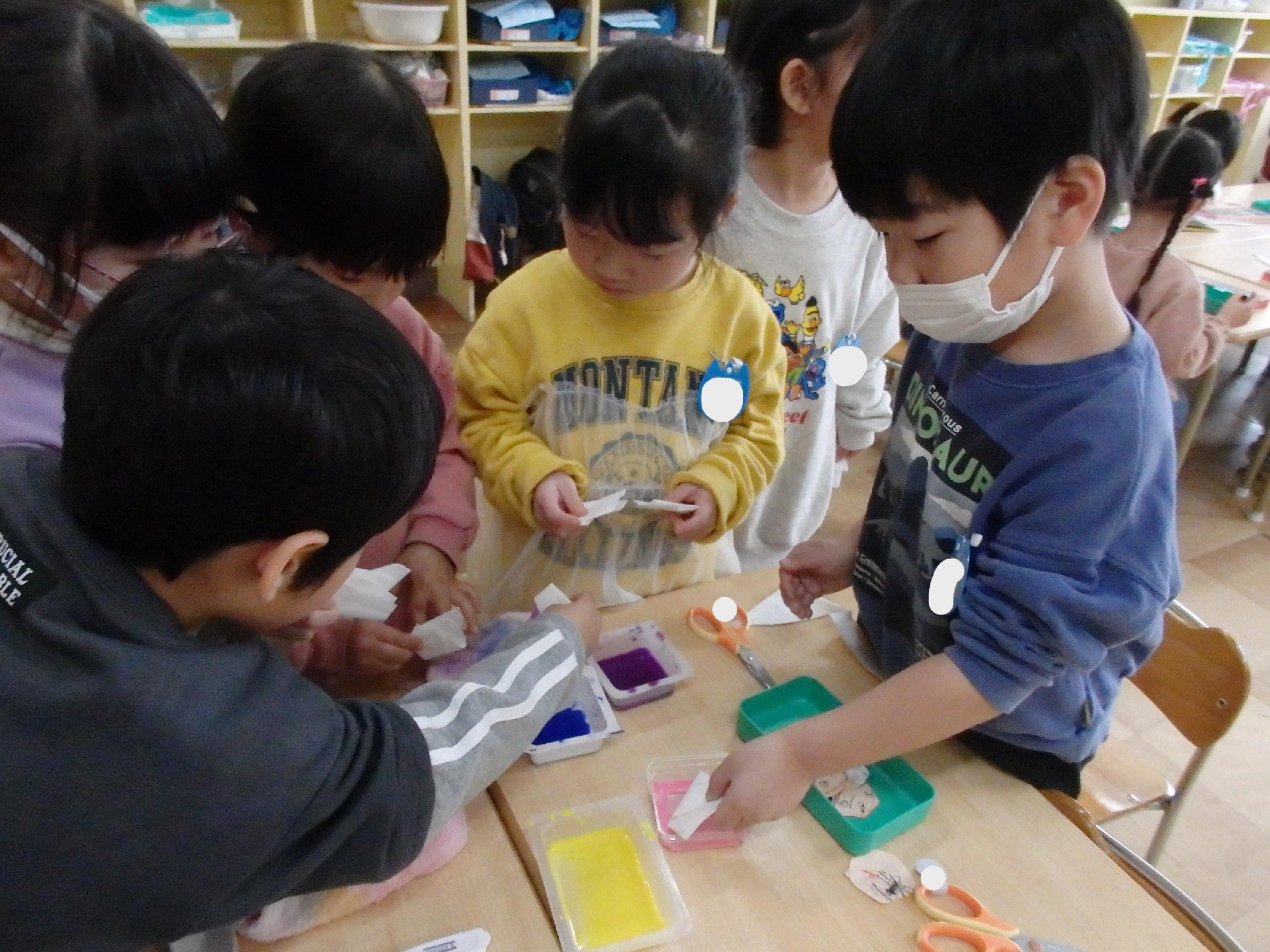 年中組では、着物の部分となる障子紙を丁寧に切り、紙染めをしました。