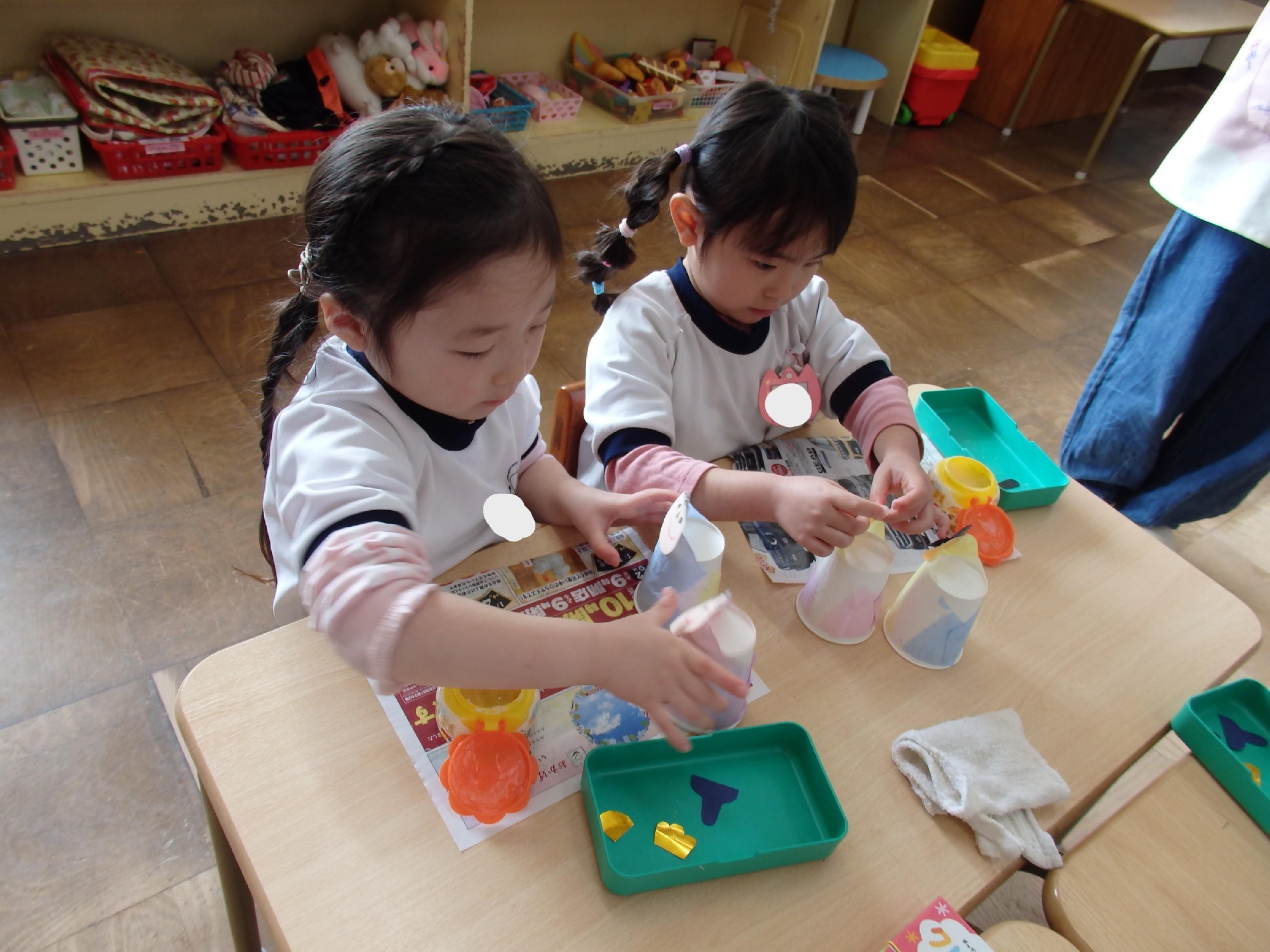 年少組では、千代紙を手でちぎって紙コップに貼り、素敵な着物を作りました!