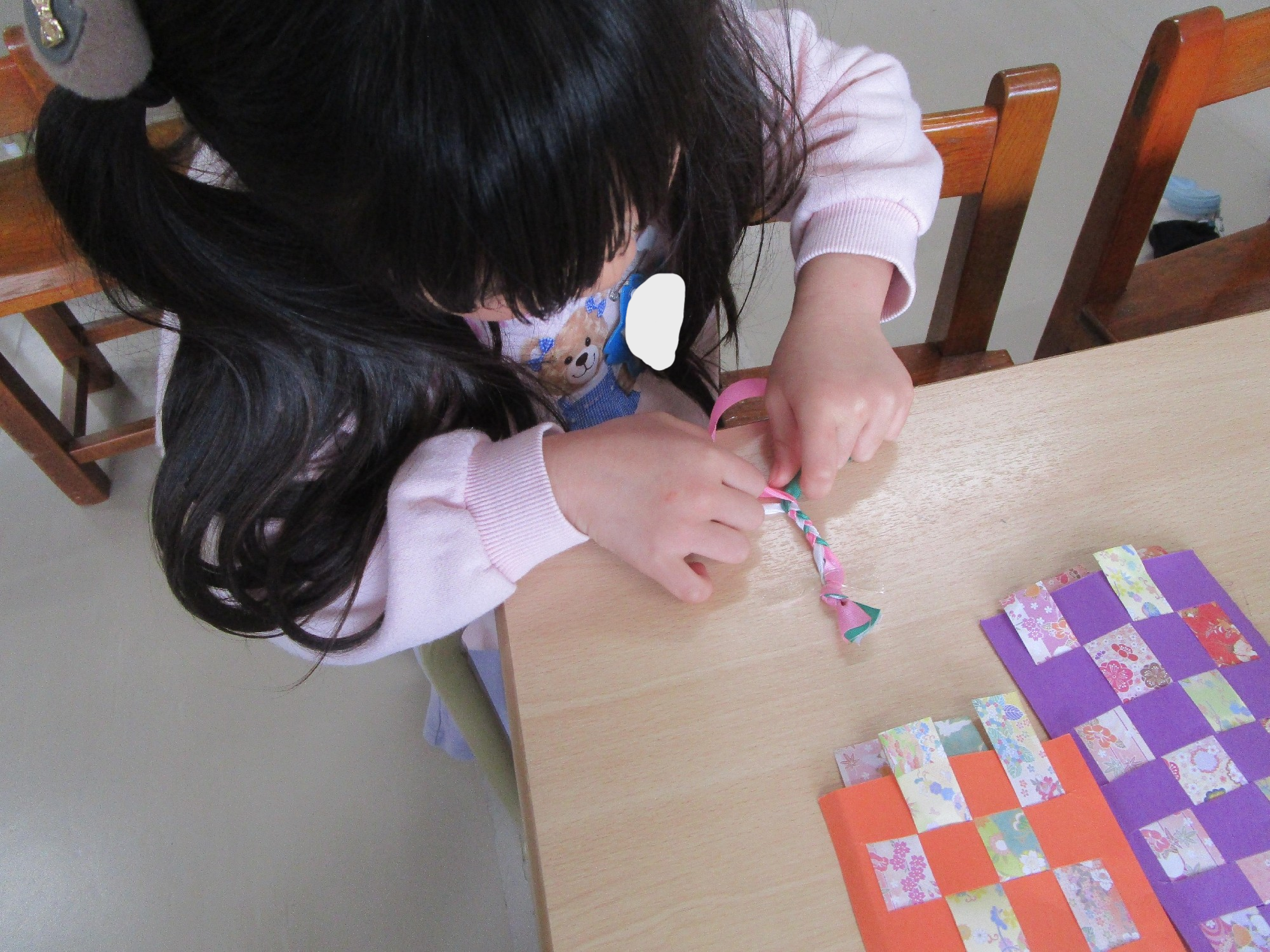 飾るための紐部分として三つ編みに挑戦!「外側を真ん中に持ってきて…」と独り言を言いながら一生懸命編んでいましたよ😊