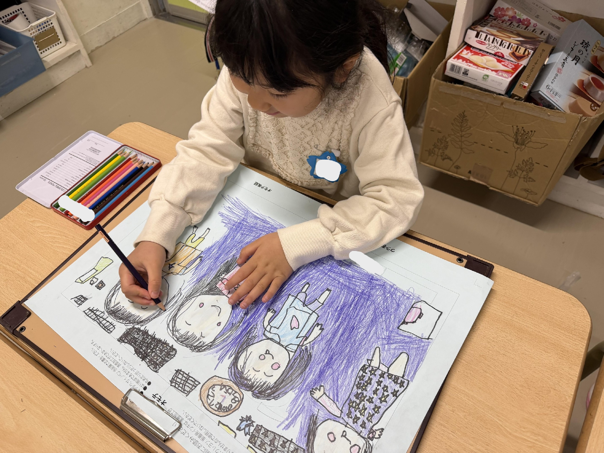 描きながら友達同士で、そして、それを担任に伝えながらの思い出話がとっても生き生きとしていて、子どもたちの幼稚園生活が楽しい想い出でいっぱいだったことが伝わり、嬉しくなります。