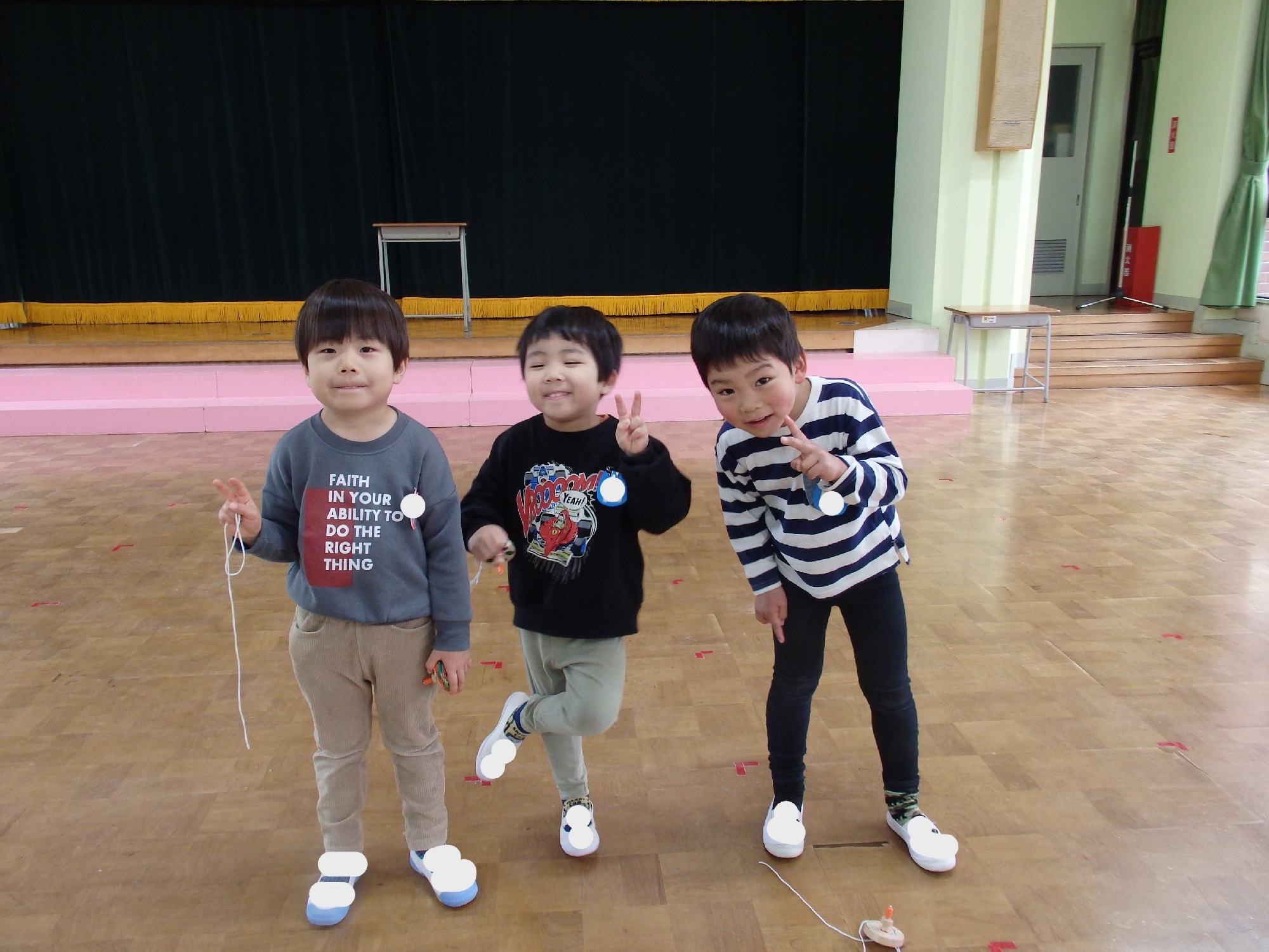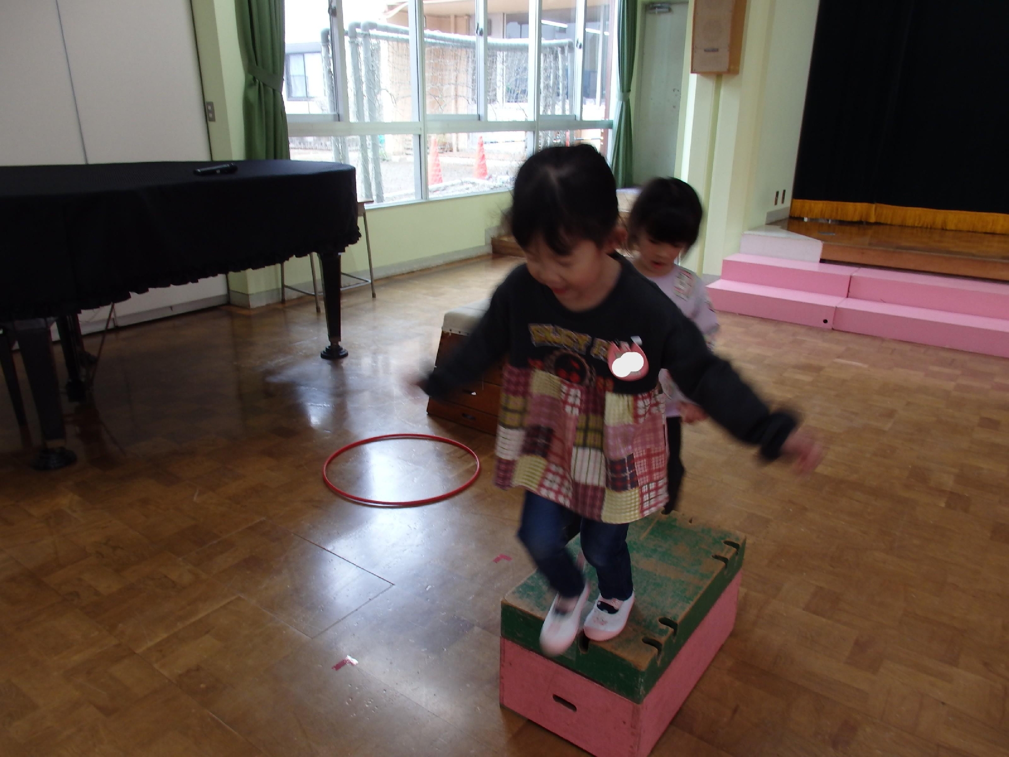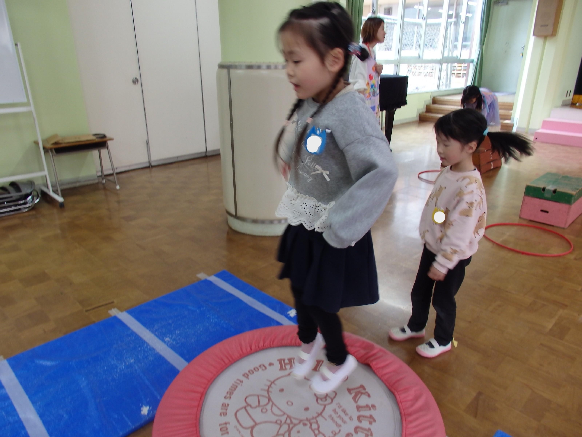 けんけんぱや手押し車、跳び箱、トランポリンなどを使って体を動かして楽しみました♪