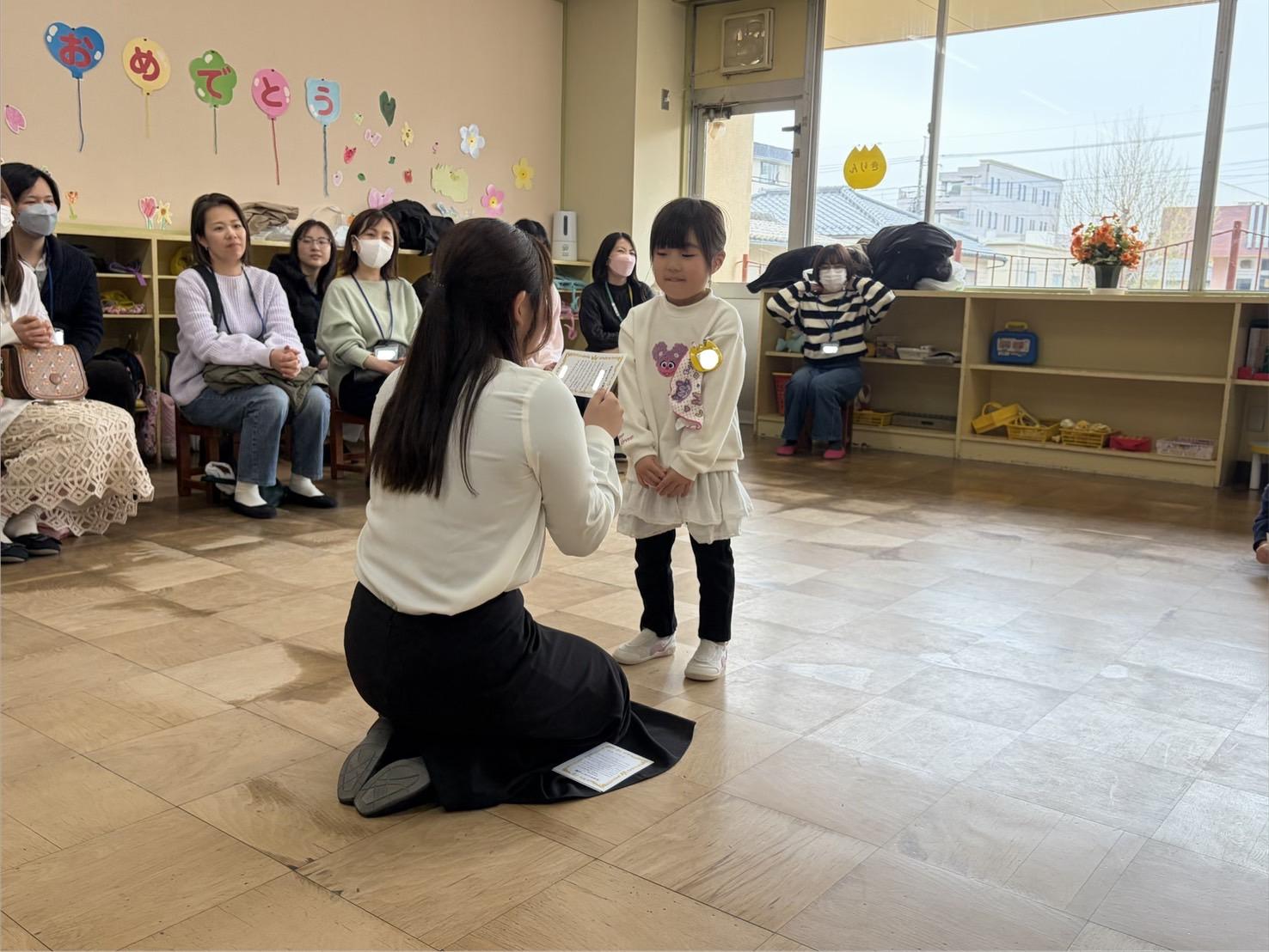 そして、担任が「大きくなった賞」を一人ひとりに渡し、子ども達と保護者の方と一緒に成長を喜び合いました♪