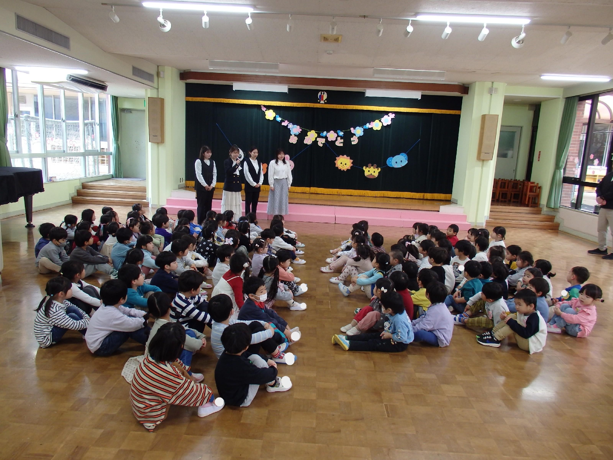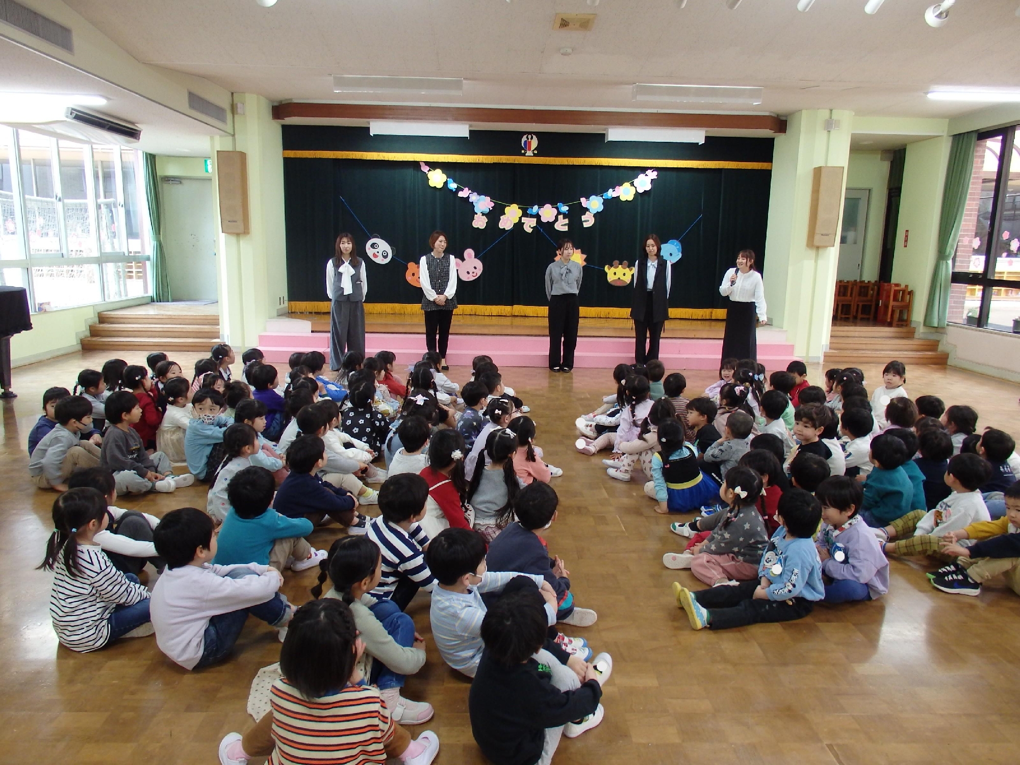 ホールで理事長先生や園長先生の話を聞いて、「修了おめでとう!」とみんなで喜び合いました😊